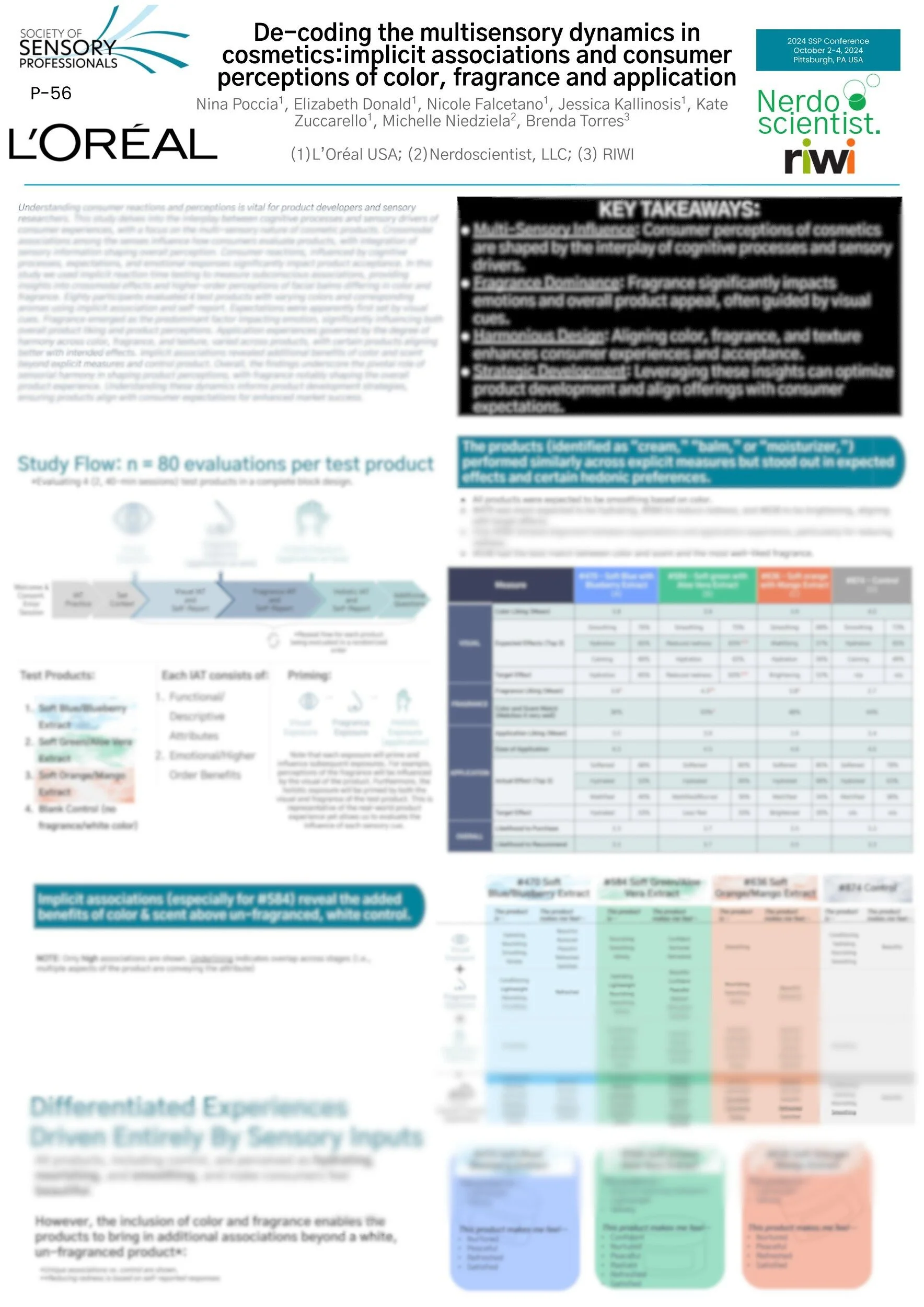 At the 2024 Society for Sensory Professionals meeting, we teamed up with L’Oréal to explore how consumers experience cosmetic products—not just through what they say, but also through what they implicitly associate. Our poster, “Decoding the Multisensory Dynamics in Cosmetics,” dug into how color, fragrance, and application together shape emotional and sensory perception of skin creams, balms, and moisturizers.